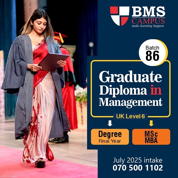 Enroll for the Graduate Diploma in Management (UK Level 6) at BMS Campus Sri Lanka. Join Batch 86 for July 2025 Intake. Complete your Degree Final Year and progress to MSc or MBA. Limited seats.