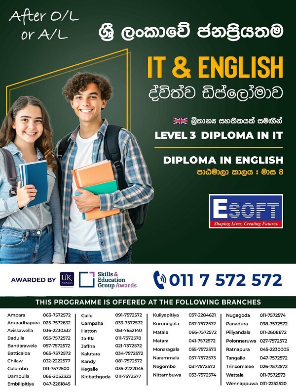 Kickstart your IT and English career with a Level 3 Diploma from Esoft! Open to students after O/L or A/L. Available at multiple locations. Contact us today to enroll!